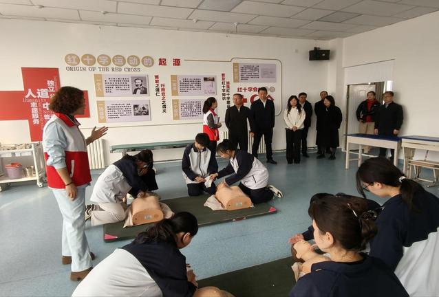 调研期间,边晓副会长一行参观了石河子大学护士学校人体生命科学馆,详细了解馆内生命教育、救护技能实训等模块的建设情况,并现场观摩救护培训指导中心的实操教学。在救护培训指导中心,领导们与师生深入交流,询问心肺复苏(CPR)、创伤包扎等课程的开展频次及培训效果,对学校将红十字精神及救护技能融入各专业教学的创新模式给予充分肯定。